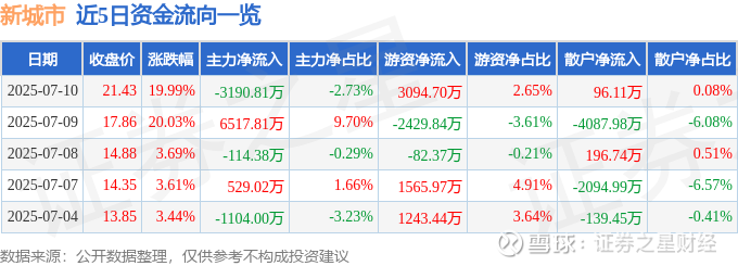 证券之星消息,新城市7月10日涨停收盘,收盘价21.43元。该股于13点57分涨停,4次打开涨停,截止收盘封单资金为2115.29万元,占其流通市值0.48%。