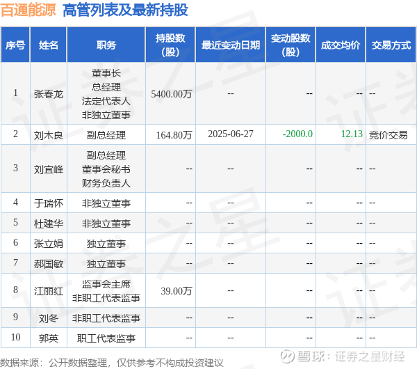 百通能源近半年内的董监高及核心技术人员增减持详情如下: