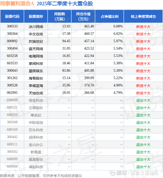 根据2025基金半年报公募基金重仓股数据,重仓该股的公募基金共1家,其中持有数量最多的公募基金为同泰基金的同泰慧利混合A。同泰慧利混合A目前规模为0.3亿元,最新净值1.1116(7月15日),较上一交易日下跌0.13%,近一年上涨17.77%。该公募基金现任基金经理为陈宗超 麦健沛。陈宗超在任的基金产品包括:同泰数字经济股票A,管理时间为2021年7月27日至今,期间收益率为-31.58%;同泰行业优选股票A,管理时间为2023年4月7日至今,期间收益率为-24.39%;同泰新能源1年持有股票A,管理时间为2025年5月12日至今,期间收益率为4.52%。麦健沛在任的基金产品包括:同泰慧择混合A,管理时间为2025年5月12日至今,期间收益率为3.33%;同泰大健康主题混合A,管理时间为2025年5月12日至今,期间收益率为13.56%;同泰行业优选股票A,管理时间为2025年5月12日至今,期间收益率为4.56%;