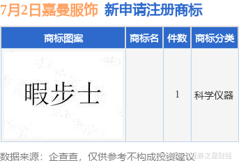 证券之星消息,根据天眼查APP数据显示,近日北京嘉曼服饰股份有限公司新提交1件商标注册申请。商标申请详情如下: