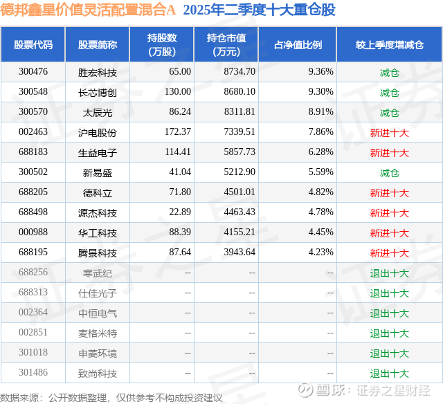 德邦鑫星价值灵活配置混合A的前十大重仓股如下: