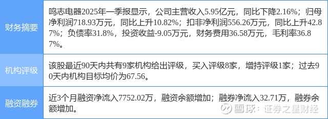 2025年5月8日,华安证券研究员张志邦,刘千琳发布了对鸣志电器的研报《静待需求复苏,机器人灵巧手前景广阔》,该研报对鸣志电器给出“买入”评级。研报中预计25/26/27年归母净利润分别为1.06/1.33/1.76亿元(25-26年前值1.79/2.19亿元),对应PE分别266/211/159倍,维持“买入”评级。证券之星数据中心根据近三年发布的研报数据计算,该研报作者对此股的盈利预测准确度为4.53%。