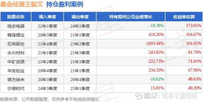 重仓股调仓示例详解:1、鸣志电器(603728)翻倍案例:王毅文管理的华商策略精选混合基金在22年1季度买入鸣志电器,在持有2年又0个季度后在24年1季度卖出。持有期间的估算收益率为173.01%,持有期间鸣志电器在2022年到2024年的年报营业总收入降幅为18.38%。2、永兴材料(002756)调仓案例:王毅文管理的华商策略精选混合基金在21年1季度买入永兴材料,在持有2个季度后在21年3季度卖出。持有期间的估算收益率为81.7%,持有期间永兴材料在2020年到2021年的年报归属净利润增幅达243.83%。3、科威尔(688551)调仓案例:王毅文管理的华商策略精选混合基金在21年4季度买入科威尔,在持有3年又0个季度后在24年4季度卖出。持有期间的估算收益率为-47.81%,持有期间科威尔在2021年到2024年的年报营业总收入增幅达93.22%。