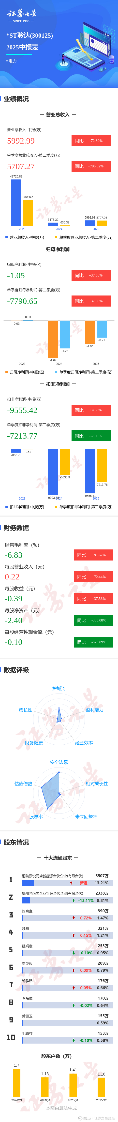 证券之星消息,*ST聆达2025年中报显示,公司主营收入5992.99万元,同比上升72.39%;归母净利润-1.05亿元,同比上升37.56%;扣非净利润-9555.42万元,同比上升4.38%;其中2025年第二季度,公司单季度主营收入5707.27万元,同比上升796.83%;单季度归母净利润-7790.65万元,同比上升37.69%;单季度扣非净利润-7213.77万元,同比下降28.11%;负债率168.33%,投资收益3.57万元,财务费用1827.11万元,毛利率-6.83%。