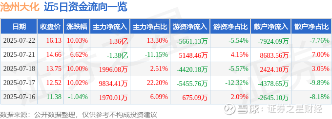 证券之星消息,沧州大化7月22日涨停收盘,收盘价16.13元。该股于10点41分涨停,未打开涨停,截止收盘封单资金为6266.38万元,占其流通市值0.94%。