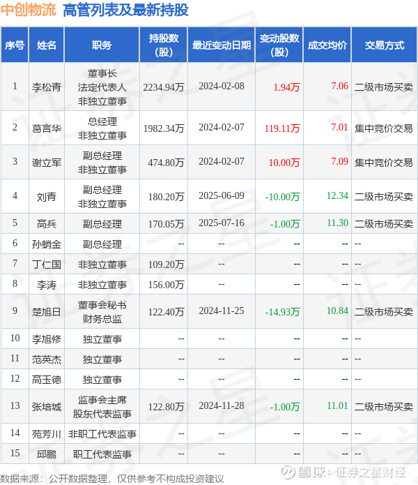 中创物流近半年内的董监高及核心技术人员增减持详情如下: