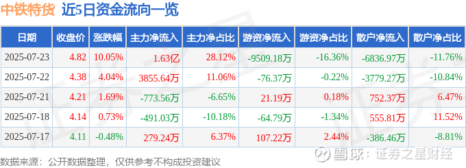 证券之星消息,中铁特货7月23日涨停收盘,收盘价4.82元。该股于9点44分涨停,未打开涨停,截止收盘封单资金为6060.14万元,占其流通市值0.28%。