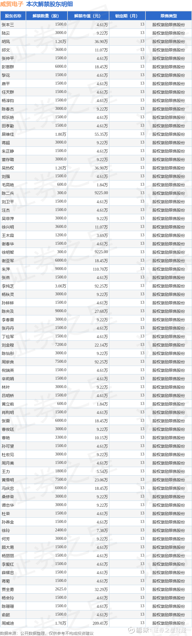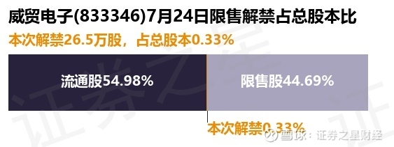 证券之星消息,根据市场公开信息整理,威贸电子(833346)于7月24日将有26.5万股限售股份解禁,为公司股权激励限售股份,占公司总股本0.33%。(本次数据根据历史公告整理得出,实际情况以上市公司最新公告为准)最近一年内,该股累计解禁1708.77万股,占总股本的21.18%。本次解禁后,公司还有3605.39万股限售股份,占总股本44.69%。具体如下图所示: