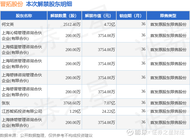 证券之星消息,根据市场公开信息整理,晋拓股份(603211)于7月25日将有2.04亿股限售股份解禁,为公司首发原股东限售股份,占公司总股本75.0%。(本次数据根据历史公告整理得出,实际情况以上市公司最新公告为准)本次解禁后,公司已无限售股份。具体如下图所示: