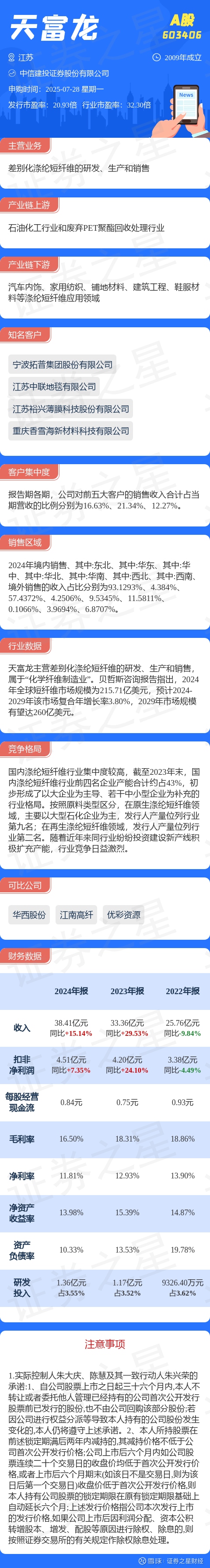 证券之星消息,天富龙7月28日网上申购,申购代码为732406,中签号公布日期为7月30日。该股概况请见下图: