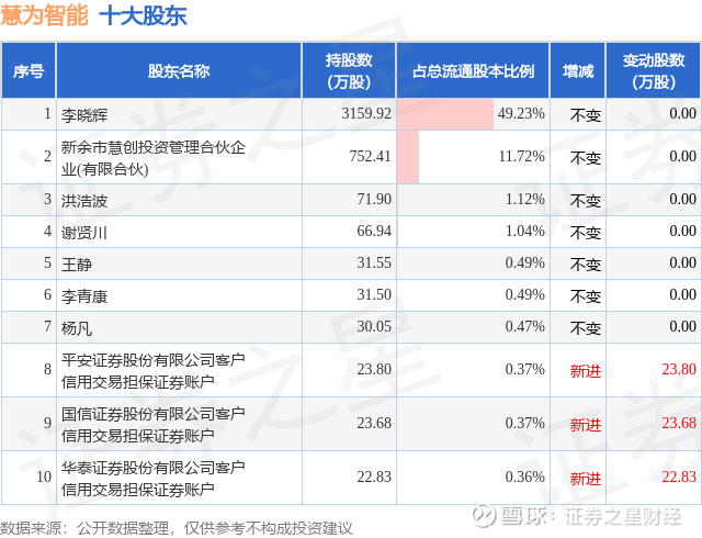 根据慧为智能2025年一季报公布的十大股东详情如下: