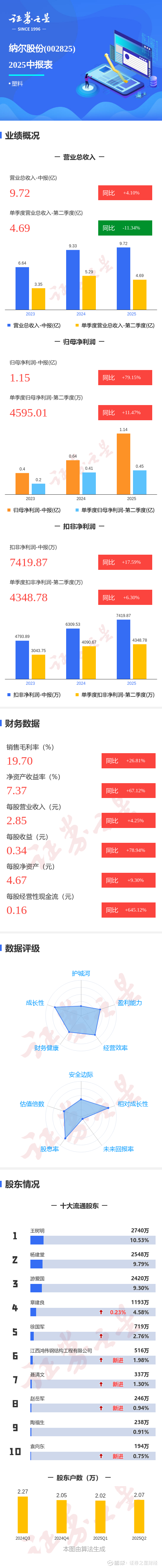 证券之星消息,纳尔股份2025年中报显示,公司主营收入9.72亿元,同比上升4.1%;归母净利润1.15亿元,同比上升79.15%;扣非净利润7419.87万元,同比上升17.6%;其中2025年第二季度,公司单季度主营收入4.69亿元,同比下降11.35%;单季度归母净利润4595.01万元,同比上升11.47%;单季度扣非净利润4348.78万元,同比上升6.31%;负债率40.5%,投资收益5795.28万元,财务费用-734.74万元,毛利率19.7%。