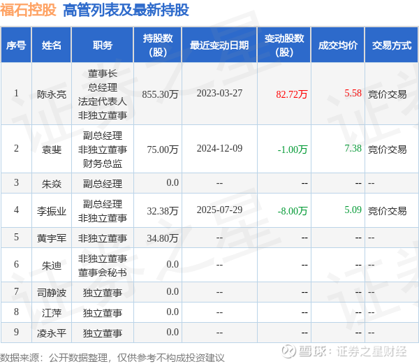 福石控股的高管列表及最新持股情况如下: