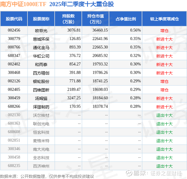 南方中证1000ETF的前十大重仓股如下: