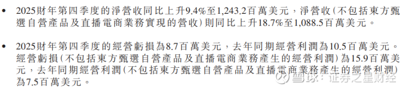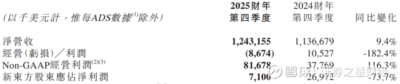 7月30日晚间,新东方-S(下称“新东方”,09901.HK)披露了2025财年年报和四季度报告。虽然本财年录得净营收、归母净利润双增,但第四财季表现不佳,录得经营亏损867.4万美元,归母净利润直降73.7%,拖累了全年盈利表现。