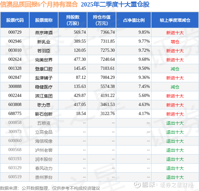 信澳品质回报6个月持有混合的前十大重仓股如下: