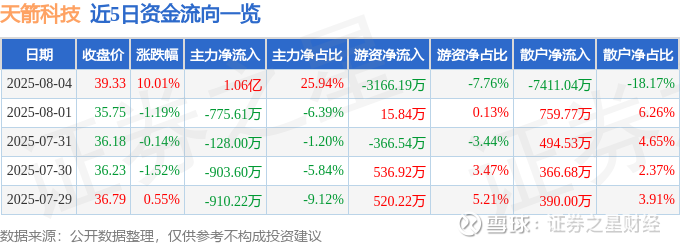 证券之星消息,天箭科技8月4日涨停收盘,收盘价39.33元。该股于10点38分涨停,未打开涨停,截止收盘封单资金为6200.66万元,占其流通市值2.37%。