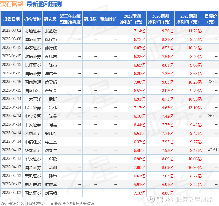 最新盈利预测明细如下: