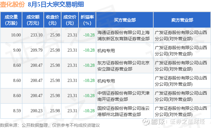 证券之星消息,8月5日壶化股份发生大宗交易,交易数据如下: