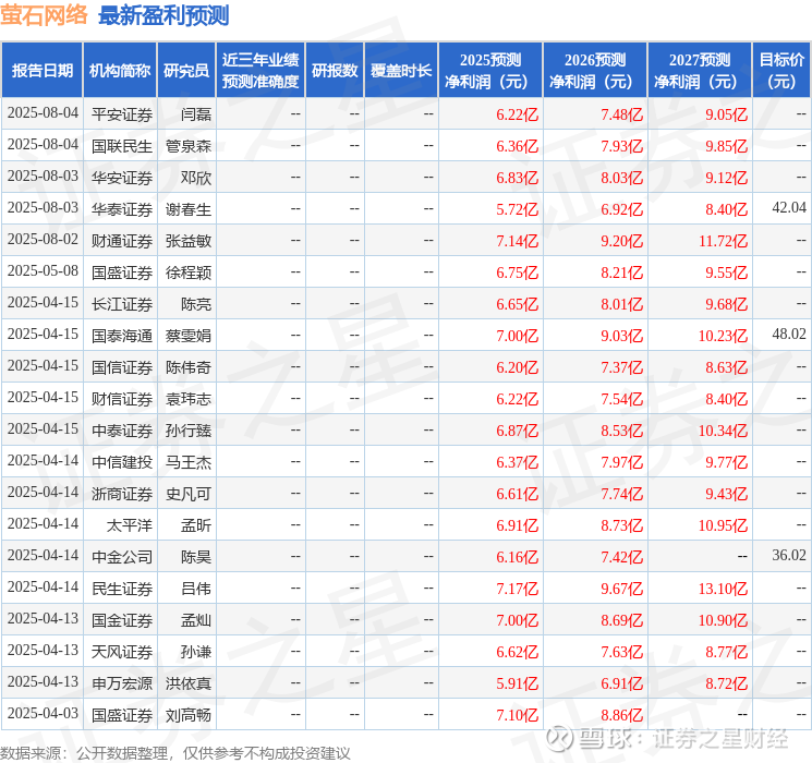 最新盈利预测明细如下: