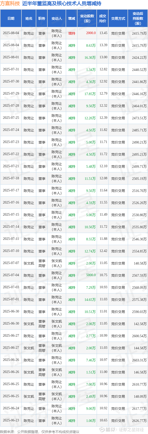 方直科技近半年内的董监高及核心技术人员增减持详情如下: