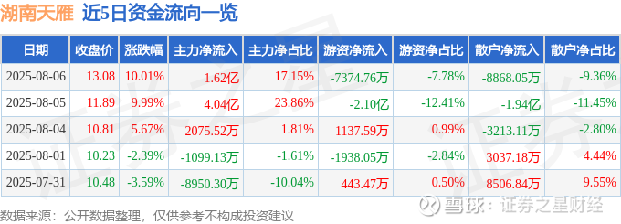 证券之星消息,湖南天雁8月6日涨停收盘,收盘价13.08元。该股于9点35分涨停,未打开涨停,截止收盘封单资金为1.51亿元,占其流通市值1.39%。
