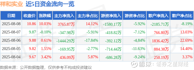 证券之星消息,祥和实业8月8日涨停收盘,收盘价10.86元。该股于11点29分涨停,5次打开涨停,截止收盘封单资金为2929.11万元,占其流通市值0.81%。