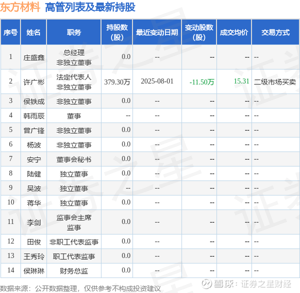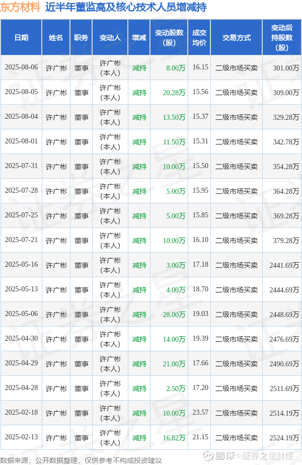 东方材料近半年内的董监高及核心技术人员增减持详情如下: