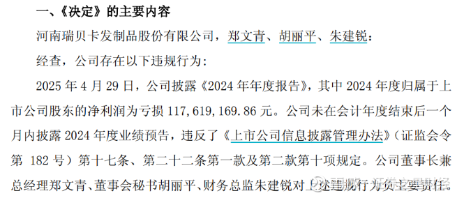 警示函显示,公司于2024年4月29日披露年报中的归母净利润为亏损1.18亿元,公司未在会计年度结束后一个月内披露2024年度业绩预告,违反了信披相关规定。为此河南监管局对公司及主要责任人郑文青、胡丽平、朱建锐采取出具警示函的行政监管措施,并记入证券期货市场诚信档案。