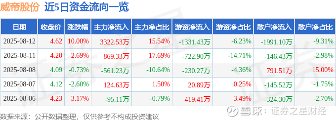 证券之星消息,威帝股份8月12日涨停收盘,收盘价4.62元。该股于14点26分涨停,4次打开涨停,截止收盘封单资金为358.23万元,占其流通市值0.14%。