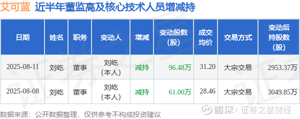 证券之星消息,根据8月12日市场公开信息、上市公司公告及交易所披露数据整理,艾可蓝(300816)最新董监高及相关人员股份变动情况:2025年8月11日公司董事刘屹共减持公司股份96.48万股,占公司总股本为1.206%。变动期间公司股价上涨13.1%,8月11日当日收盘报38.85元。
