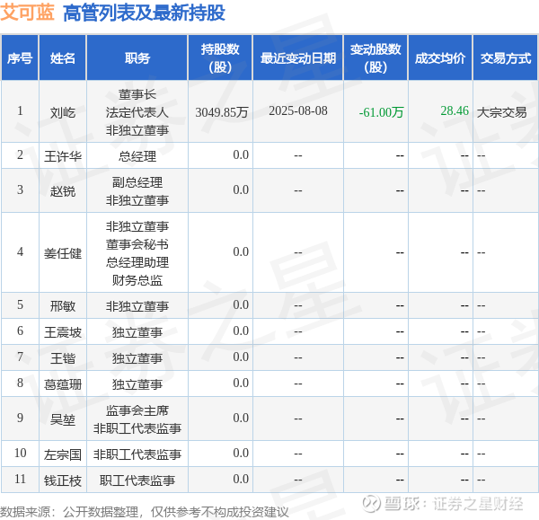 艾可蓝近半年内的董监高及核心技术人员增减持详情如下: