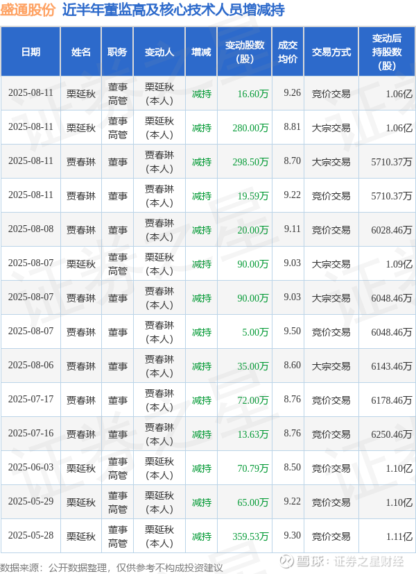 盛通股份近半年内的董监高及核心技术人员增减持详情如下: