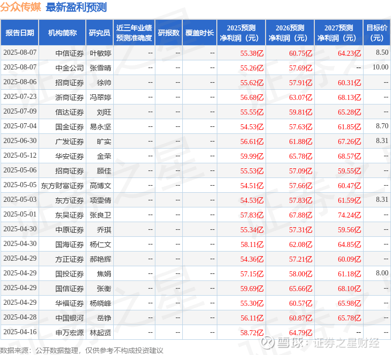 最新盈利预测明细如下:
