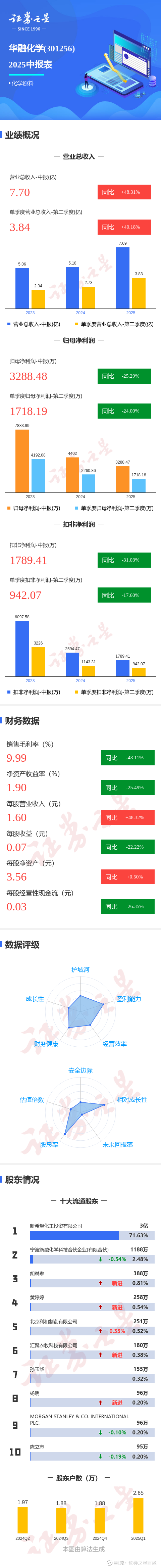 证券之星消息,华融化学2025年中报显示,公司主营收入7.7亿元,同比上升48.32%;归母净利润3288.48万元,同比下降25.3%;扣非净利润1789.41万元,同比下降31.03%;其中2025年第二季度,公司单季度主营收入3.84亿元,同比上升40.18%;单季度归母净利润1718.19万元,同比下降24.0%;单季度扣非净利润942.07万元,同比下降17.6%;负债率26.21%,投资收益1572.83万元,财务费用179.18万元,毛利率9.99%。