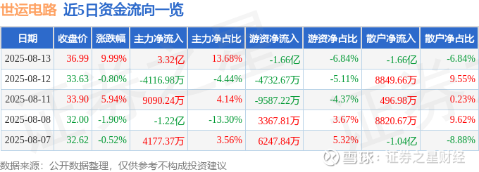 8月13日的资金流向数据方面,主力资金净流入3.32亿元,占总成交额13.68%,游资资金净流出1.66亿元,占总成交额6.84%,散户资金净流出1.66亿元,占总成交额6.84%。