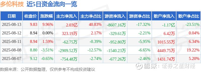 8月13日的资金流向数据方面,主力资金净流入2.03亿元,占总成交额40.83%,游资资金净流出8607.16万元,占总成交额17.32%,散户资金净流出1.17亿元,占总成交额23.51%。