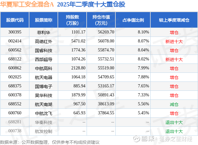 根据2025基金半年报公募基金重仓股数据,重仓该股的公募基金共125家,其中持有数量最多的公募基金为华夏基金的华夏军工安全混合A。华夏军工安全混合A目前规模为44.86亿元,最新净值1.765(8月12日),较上一交易日下跌0.9%,近一年上涨47.45%。该公募基金现任基金经理为万方方。