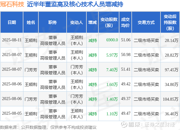 冠石科技近半年内的董监高及核心技术人员增减持详情如下: