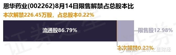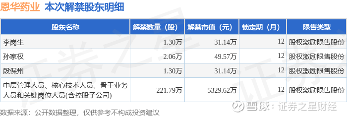 证券之星消息,根据市场公开信息整理,恩华药业(002262)于8月14日将有226.45万股限售股份解禁,为公司股权激励限售股份,占公司总股本0.22%。(本次数据根据历史公告整理得出,实际情况以上市公司最新公告为准)本次解禁后,公司还有1.32亿股限售股份,占总股本12.98%。具体如下图所示: