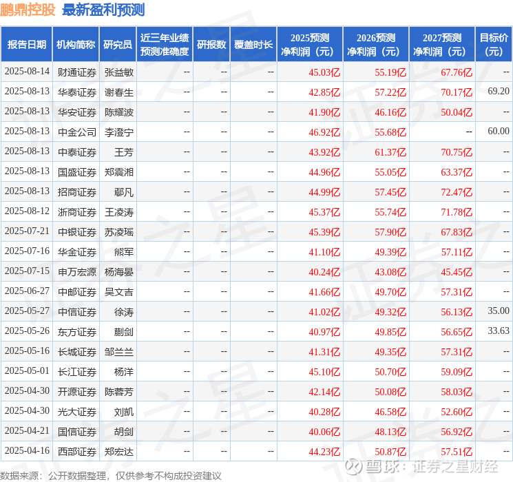 最新盈利预测明细如下: