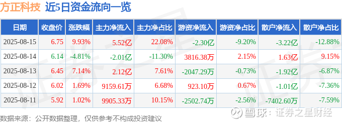 证券之星消息,方正科技8月15日涨停收盘,收盘价6.75元。该股于11点23分涨停,1次打开涨停,截止收盘封单资金为2.17亿元,占其流通市值0.77%。