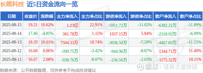 证券之星消息,长缆科技8月15日涨停收盘,收盘价19.21元。该股于10点39分涨停,2次打开涨停,截止收盘封单资金为3652.13万元,占其流通市值1.38%。