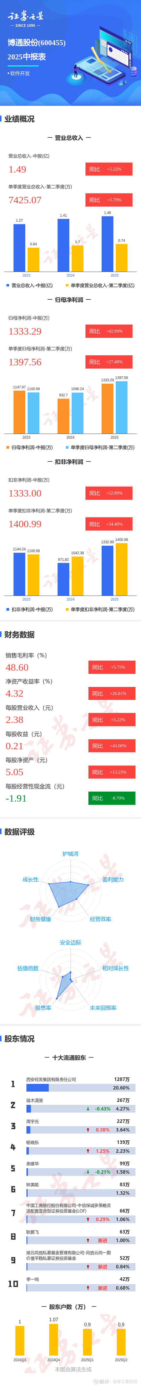 证券之星消息,博通股份2025年中报显示,公司主营收入1.49亿元,同比上升5.23%;归母净利润1333.29万元,同比上升42.95%;扣非净利润1333.0万元,同比上升52.9%;其中2025年第二季度,公司单季度主营收入7425.07万元,同比上升5.79%;单季度归母净利润1397.56万元,同比上升27.49%;单季度扣非净利润1400.99万元,同比上升34.4%;负债率61.23%,财务费用283.04万元,毛利率48.6%。