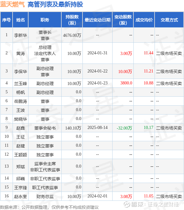蓝天燃气近半年内的董监高及核心技术人员增减持详情如下: