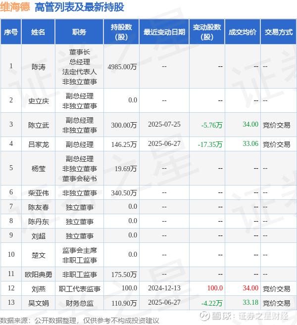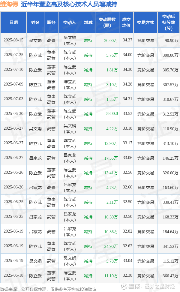 维海德近半年内的董监高及核心技术人员增减持详情如下: