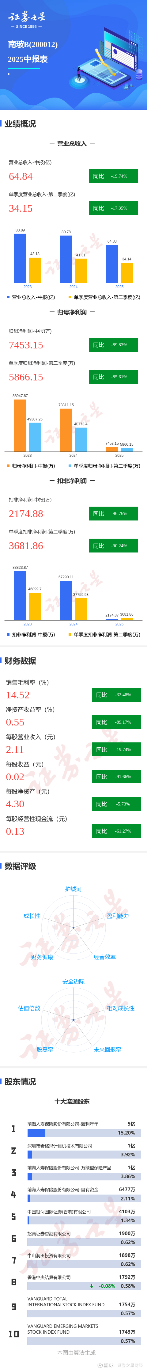 证券之星消息,南玻B2025年中报显示,公司主营收入64.84亿元,同比下降19.75%;归母净利润7453.15万元,同比下降89.83%;扣非净利润2174.88万元,同比下降96.77%;其中2025年第二季度,公司单季度主营收入34.15亿元,同比下降17.35%;单季度归母净利润5866.15万元,同比下降85.61%;单季度扣非净利润3681.86万元,同比下降90.25%;负债率56.84%,投资收益-445.14万元,财务费用9257.3万元,毛利率14.52%。
