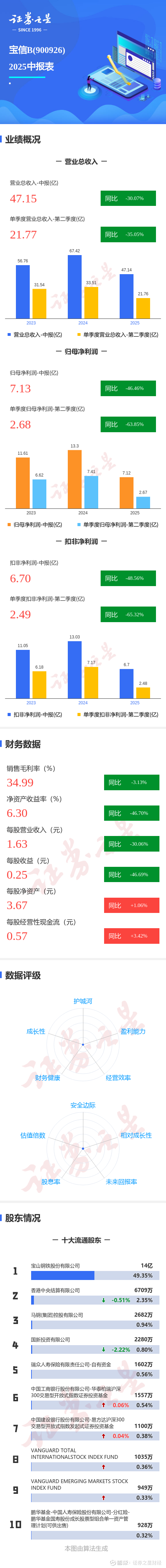 证券之星消息,宝信B2025年中报显示,公司主营收入47.15亿元,同比下降30.08%;归母净利润7.13亿元,同比下降46.46%;扣非净利润6.7亿元,同比下降48.56%;其中2025年第二季度,公司单季度主营收入21.77亿元,同比下降35.05%;单季度归母净利润2.68亿元,同比下降63.86%;单季度扣非净利润2.49亿元,同比下降65.33%;负债率47.06%,投资收益-413.19万元,财务费用-1540.41万元,毛利率34.99%。