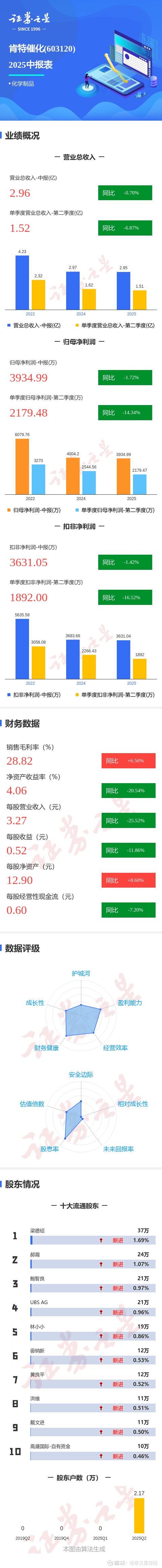 证券之星消息,肯特催化2025年中报显示,公司主营收入2.96亿元,同比下降0.71%;归母净利润3934.99万元,同比下降1.73%;扣非净利润3631.05万元,同比下降1.43%;其中2025年第二季度,公司单季度主营收入1.52亿元,同比下降6.88%;单季度归母净利润2179.48万元,同比下降14.35%;单季度扣非净利润1892.0万元,同比下降16.52%;负债率11.95%,财务费用-128.03万元,毛利率28.82%。