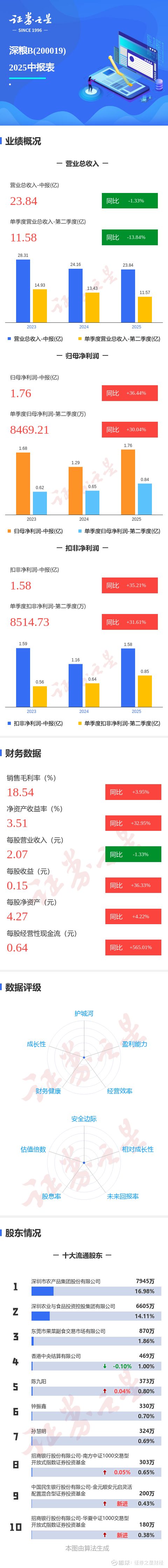 证券之星消息,深粮B2025年中报显示,公司主营收入23.84亿元,同比下降1.33%;归母净利润1.76亿元,同比上升36.44%;扣非净利润1.58亿元,同比上升35.21%;其中2025年第二季度,公司单季度主营收入11.58亿元,同比下降13.84%;单季度归母净利润8469.21万元,同比上升30.05%;单季度扣非净利润8514.73万元,同比上升31.62%;负债率30.24%,投资收益-446.27万元,财务费用1904.19万元,毛利率18.54%。